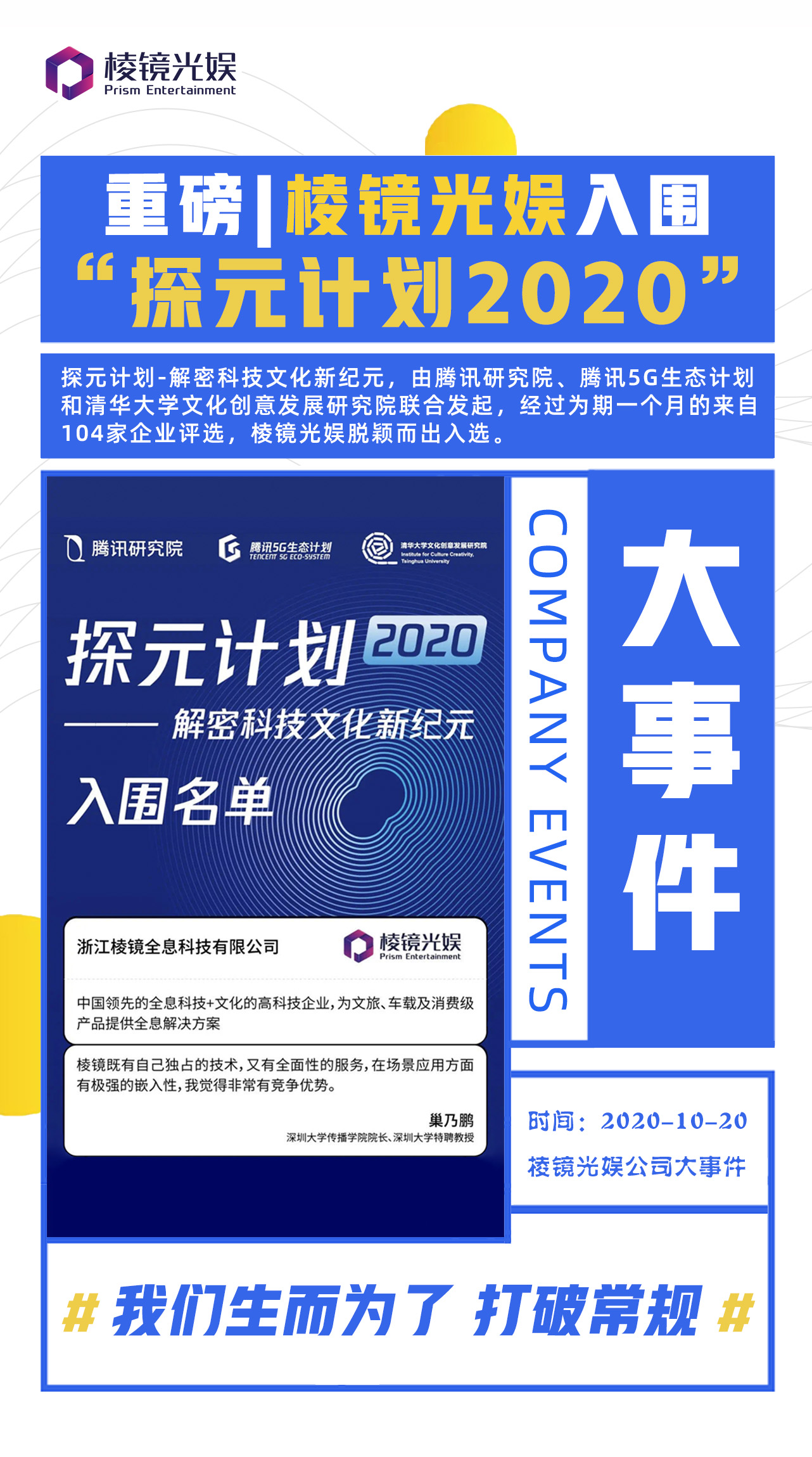昨日,棱镜光娱成功入围,由腾讯研究院、腾讯5G生态计划和清华大学文化创意发展研究院联合发起的“探元计划2020”。